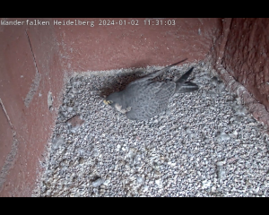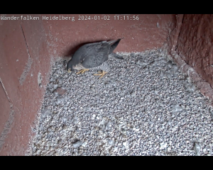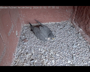 Wie jedes Jahr beginnt die Balzsaison mit einer sorgfältigen Prüfung des zukünftigen „Kinderzimmers“: Die Terzel, in unserem Revier ZEPHYR, bieten dem Weibchen, bei uns LISELOTTE, potentielle Nistplätze an. Bald sehen wir deshalb beide Falken in den Nistkasten hinein rauschen …