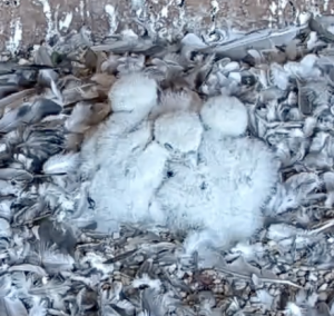 Das Trio im Falkenzimmer der Turmspitze ist inzwischen in einem Alter, in dem die Küken nicht mehr rund um die Uhr von den Eltern gehudert und betreut werden. So sehen wir heute, wie jedes Jahr, die Wärmepyramide!