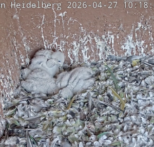 Bei den drei 2026- Küken formen sich diese „Federorgane“ nun aus. Blutkiele, weil sie bei Verletzung leicht bluten, heißen die bläulich glänzenden Hornscheiden der Zapfen, die nun am Stoß und an den Flügeln bald sichtbar werden. Bald werden diese Hornzapfen an der Spitze eintrocknen und es erscheint die zunächst noch eingerollte Federfahne, die sich allmählich zur Fläche entrollt. Dabei wird die Pelzdune aus ihrer Hauttasche ausgeschoben.