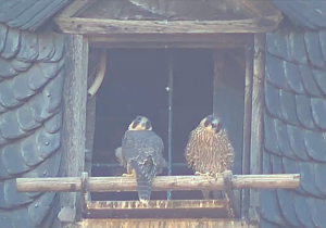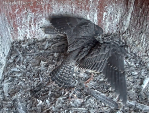 Dazu kann ich z.Zt. leider nichts berichten. Wir sind hier auf Fotos und Berichte von Augenzeugen aus der Heidelberger Altstadt angewiesen. Ich vermute, dass sich die VIER bevorzugt auf dem Umlaufbalkon , den Nischen und Ecken der Turmspitze der nahen JESUITENKIRCHE , ggf. auch dem dortigen Kirchendach und auf dem Eingangsportal aufhalten. Auch das Kreuz auf dem Kapellchen der Heiliggeistkirche und das Gitter des Kapellchens waren bisher Treff- und Aufenthaltspunkte der ausgeflogenen Jungfalken. Auch ihre Bettelrufe müssten über der Altstadt gelegentlich auffallen. Ihre Flüge am Himmel sind selbstverständlich kaum zu dokumentieren, aber bestimmt zu beobachten. Inzwischen kreisen sie bestimmt schon in großer Höhe und verfolgen sich gegenseitig.