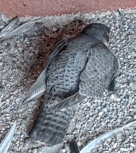 Wenn, vermutlich noch heute, LISELOTTE das dritte Ei legen wird, beginnt die Brutphase. (Diesen Termin werde ich notieren, denn wir kennen dann ziemlich genau den Termin des Schlupfs. Ich habe in meinem „Tagebuch“ seit dem Jahr 2000 „Buch geführt.“) Es gibt seit langer Zeit sehr viele Erkenntnisse über Wanderfalken, denn der Wanderfalke ist ja geradezu eine IKONE der Vogelwelt.  Als 1972 in Deutschland erstmals ein VOGEL DES JAHRES gewählt wurde, nannte man den Wanderfalken. Hier, auf Heiliggeist, ist der Schlupf des 1. Kükens etwa nach 32 bis 34 Tagen. (Da die Falken Lebewesen sind, ist der Termin nicht exakt zu benennen, so ist es ja auch bei uns Menschen.)