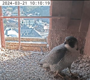 Heute Nacht waren es 5° C in Heidelberg, vielleicht gab es dort oben im Turm noch einen kalten Winddruck? So passte LISELOTTE sich der Temperatur an und bedeckte die beiden Eier. Auch RUPERT gehorchte dem „Befehl der Natur“ und blieb am Morgen bei der Ablösung auf dem Gelege. Das dritte Ei wird wohl heute folgen. Dann beginnen die Falken mit der Brut.
