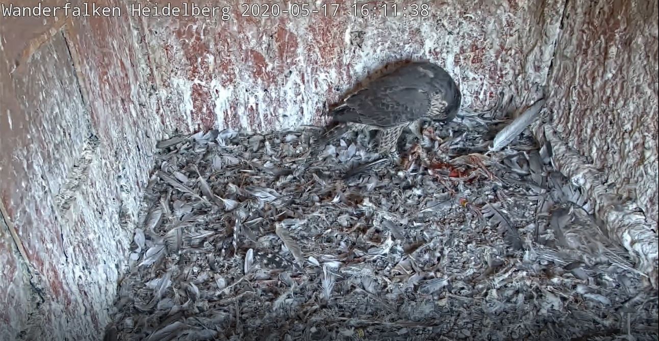 gerade um halb fünf waren es wieder 4 Falkenkinder. Die Mutter kanns nicht sein weil alle einen kleinen flaum am Kopf haben, der reingekommen ist frisst den Rest