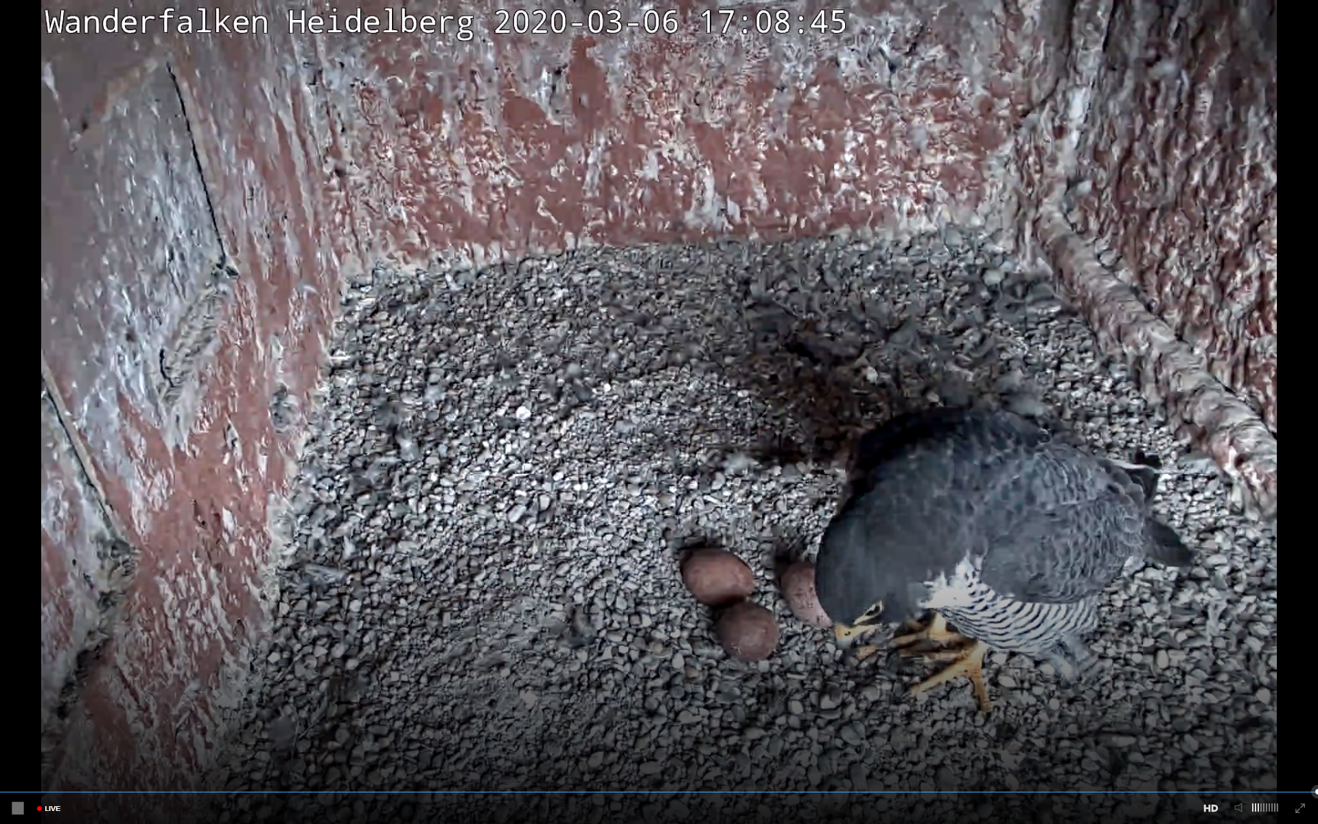 9:37 - das Gelege ist ganz kurz frei einsehbar wegen Wechsel des brütenden Elternteils - es sind immer noch drei Eier. Könnte es sein, dass es heuer tatsächlich bei drei bleibt?